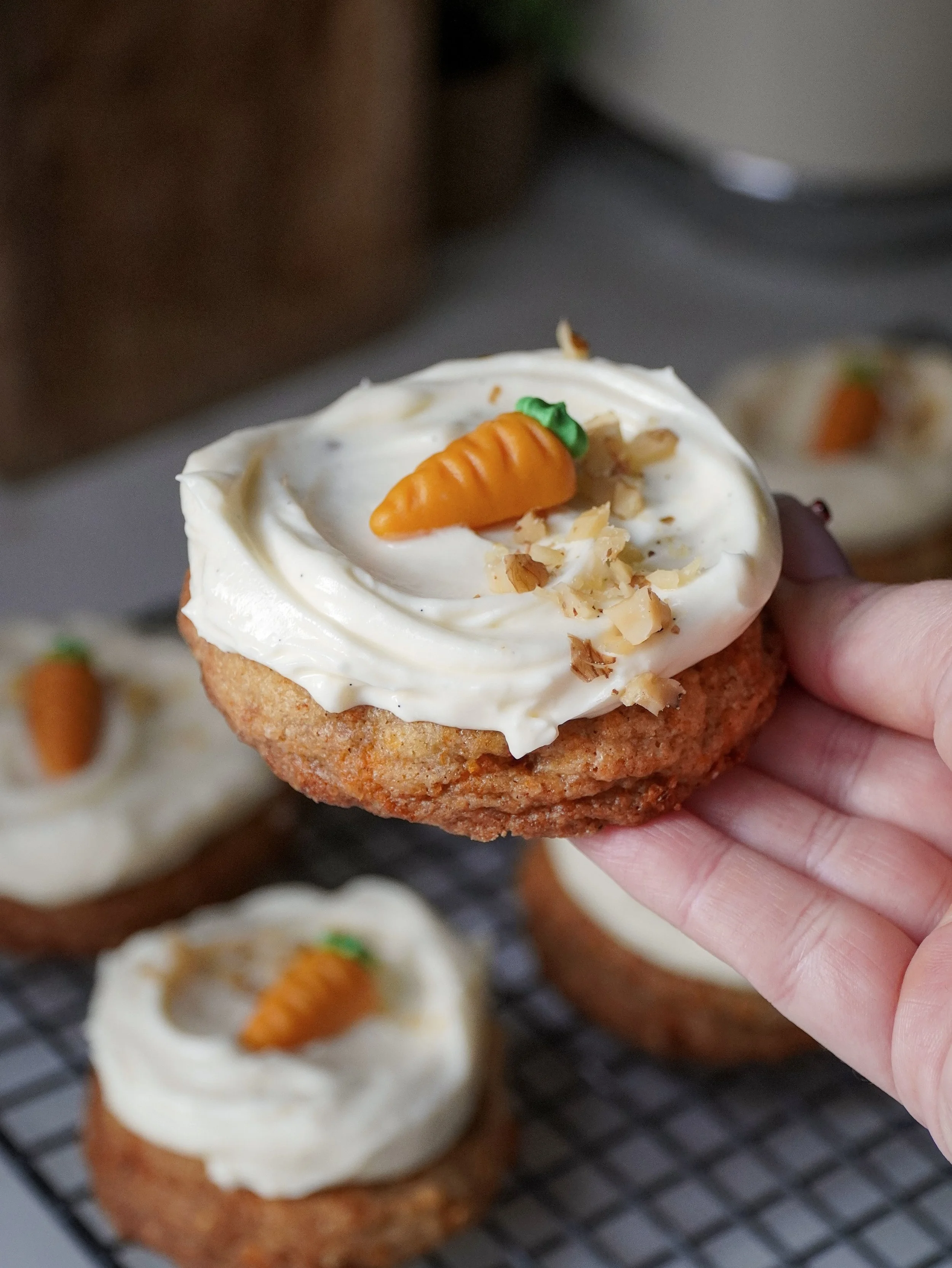 These Carrot Cake Cookies make 10 larger cookies. I used a 5.5 cm cookie scoop (about 2.2 inches), which gives you thick, bakery-style cookies. If you prefer smaller ones, you can just scoop less dough and make more cookies.