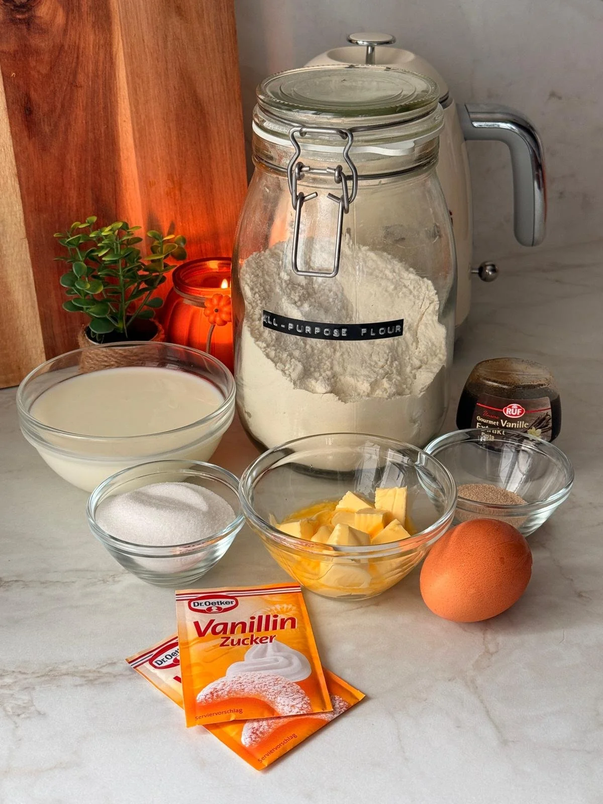 - By hands: in a large bowl, whisk together the flour, sugar, vanilla sugar and instant dry yeast. Then add the milk, the egg, vanilla bean paste and softened butter. Using a dough whisk or a wooden spoon, mix until it turns into a shaggy dough. Once ready, turn it over a lightly floured work surface and knead until you get a smooth and elastic dough.