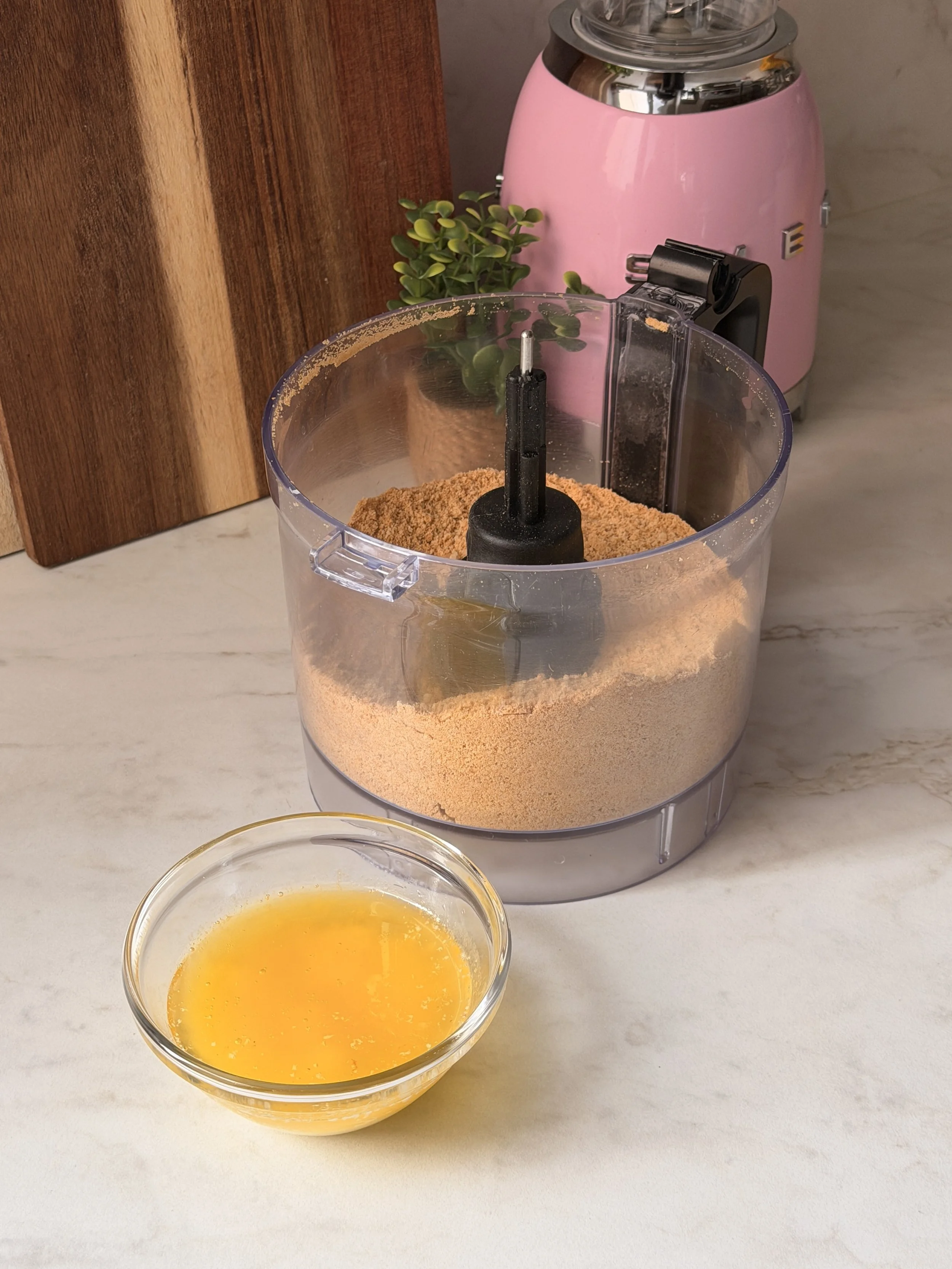7. Using a food processor, crush the graham crackers into fine crumbs and combine them with the melted butter.