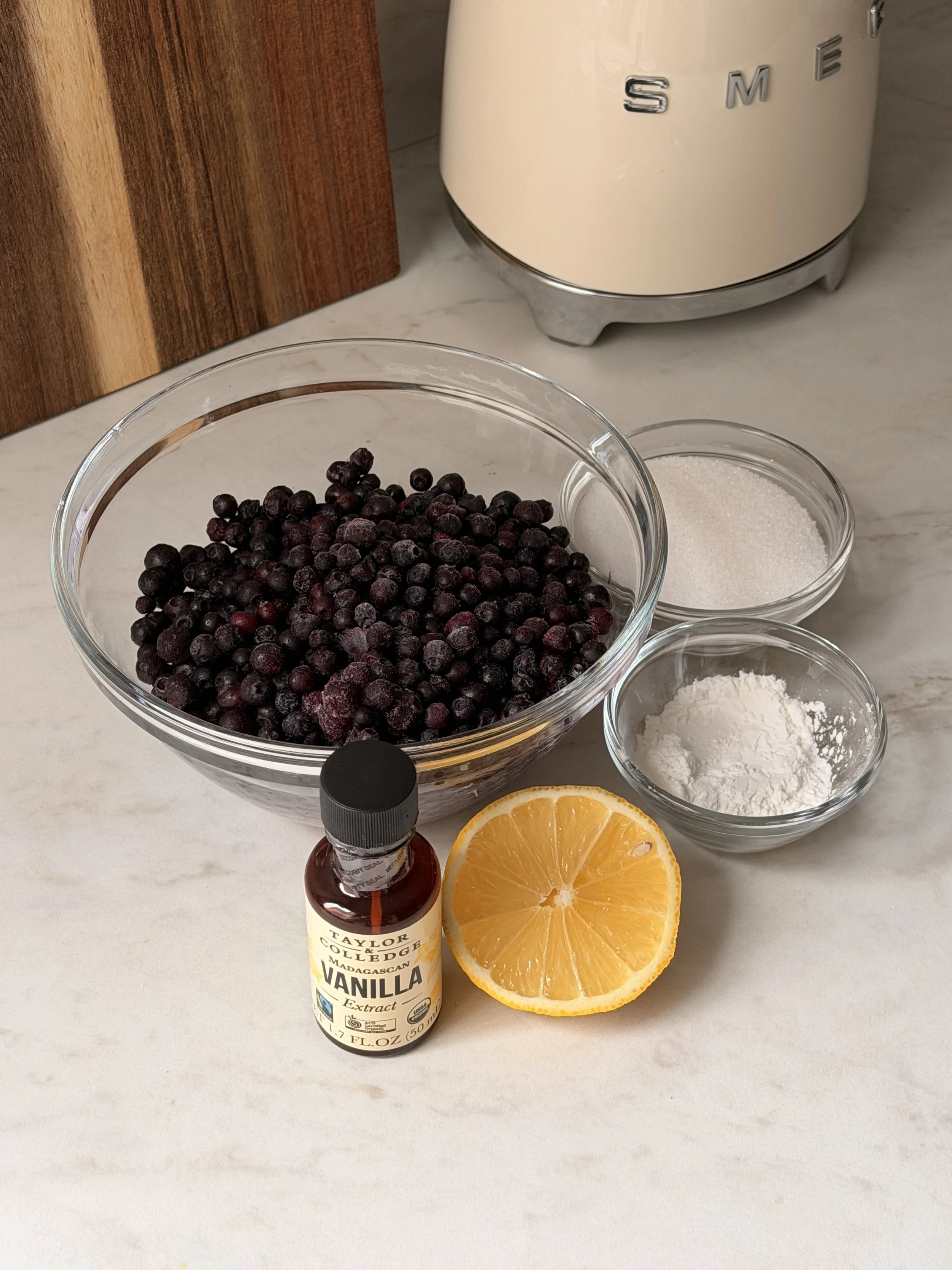 2. In a medium saucepan, combine the wild blueberries, granulated sugar, lemon juice and vanilla extract.