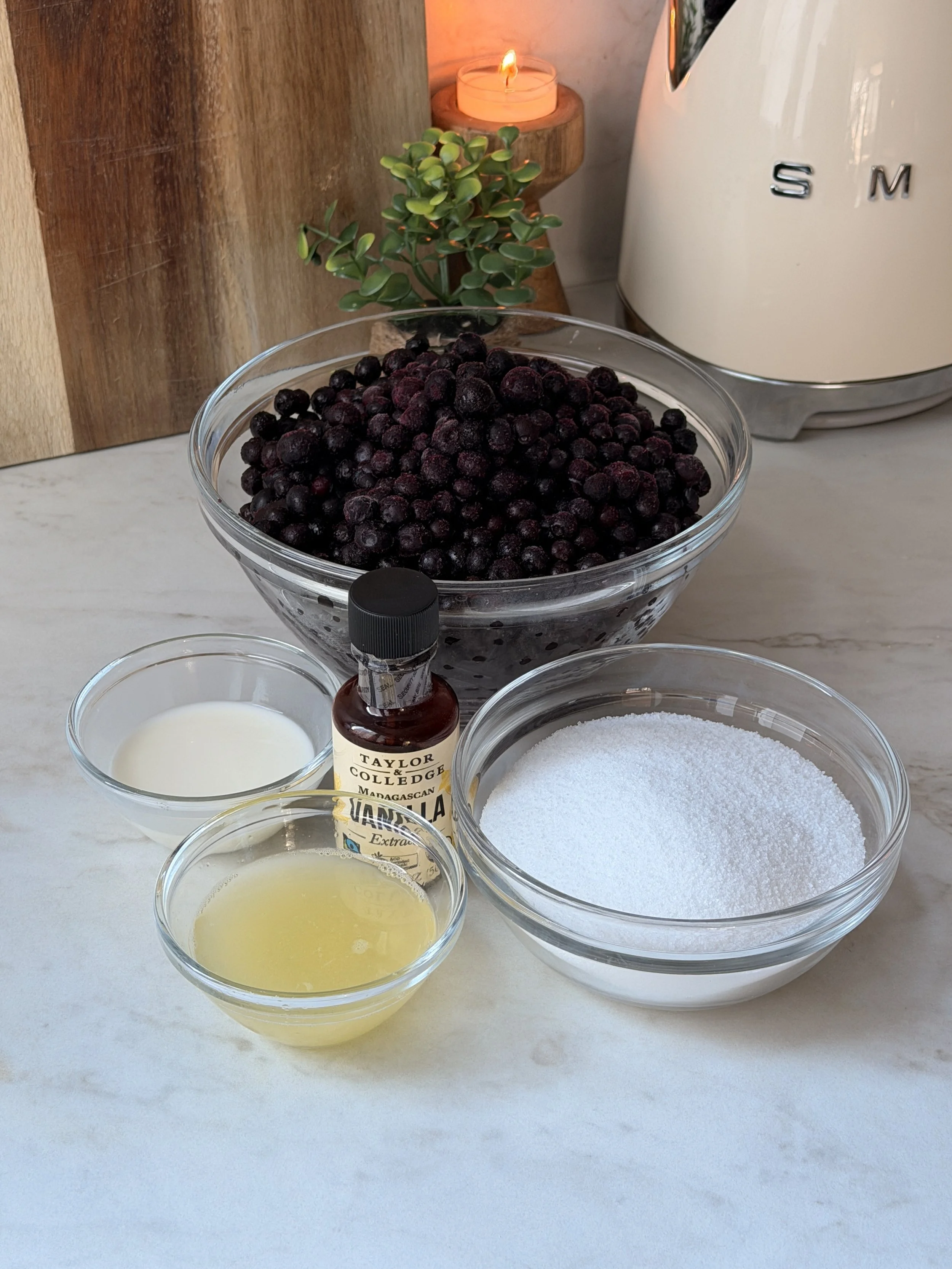 - 150g wild blueberry jam, blended smooth (the one we made earlier) (1/2 cup + 2 tablespoons)